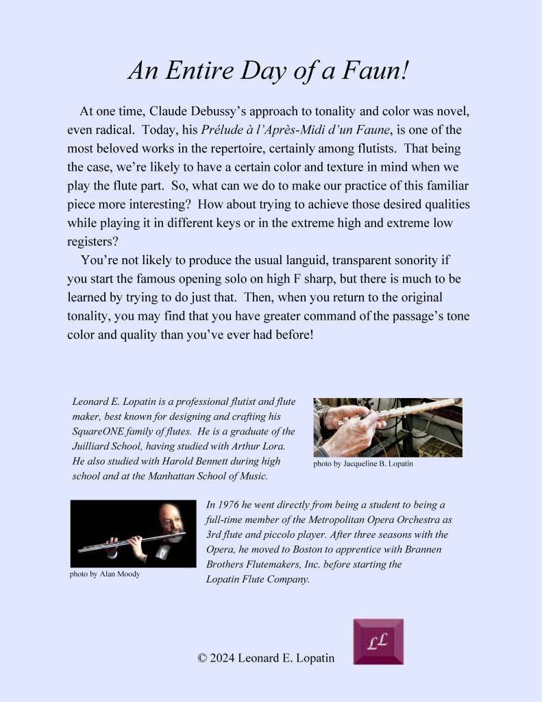 In A Full Day of the Faun, I’ve written out the main solo and the other important passages, then written them out in every key, up and down the entire practical range (and a fair bit of the not-very-practical range!) of the flute. Why? With such a well-known and well-loved work, we already have in mind a certain tone color and quality that these passages “ought” to have, when performed as written by Debussy. The challenge I present to you here is this: Try to play each of these examples as if it were the way he had actually written it, and try to create the exact same tone color and quality it would have in the original. It’s not too difficult a semitone or two removed from the original, but how about an octave higher or a ninth lower? Oh, that’s different! Of course, it’s best to start out practicing the examples only a semitone or two higher or lower. Choose one and see if you can play it in such a way that it might fool a listener (one who does not have perfect pitch!). Start the famous solo on a D or a C natural and see how convincing you can make it. Keep working your way out toward the extremes, and see how you do. You’ll find it gets quite interesting!